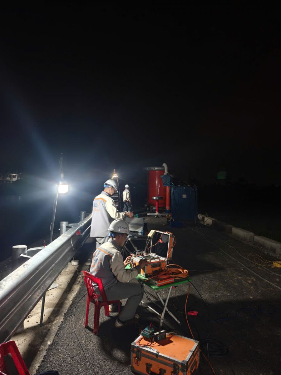 Trong quá trình triển khai, VEngy đã thực hiện đầy đủ và nghiêm ngặt các hạng mục thí nghiệm theo quy định hiện hành đối với hệ thống cáp ngầm 110kV. Các hạng mục thí nghiệm bao gồm kiểm tra điện trở cách điện, thí nghiệm điện áp chịu đựng một chiều (DC), xoay chiều (AC) kết hợp kiểm tra phóng điện cục bộ (PD), cũng như đánh giá tổng thể tình trạng kỹ thuật của toàn bộ tuyến cáp trước khi đóng điện. Mỗi bước đều được thực hiện với sự giám sát chặt chẽ của đội ngũ kỹ sư giàu kinh nghiệm, đảm bảo tuân thủ các tiêu chuẩn kỹ thuật quốc gia và quy trình vận hành của ngành điện.
